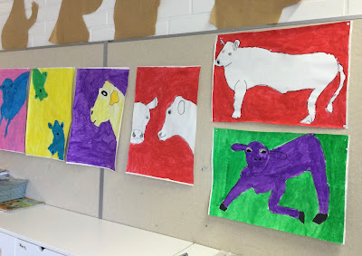 Neloset ovat taiteilleet värikkäitä lehmiä koulun ruokalaan. Ensin tutkimme Miina Äkkijyrkän maalauksia ja hänen värien käyttöä.